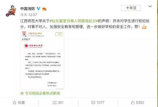 江西师范大学关于#仙女寝室当事人将面临处分#的声明:并未对学生进行校纪处分。对事不对人,加强安全教育和管理,进一步做好学校的安全工作。赞!
