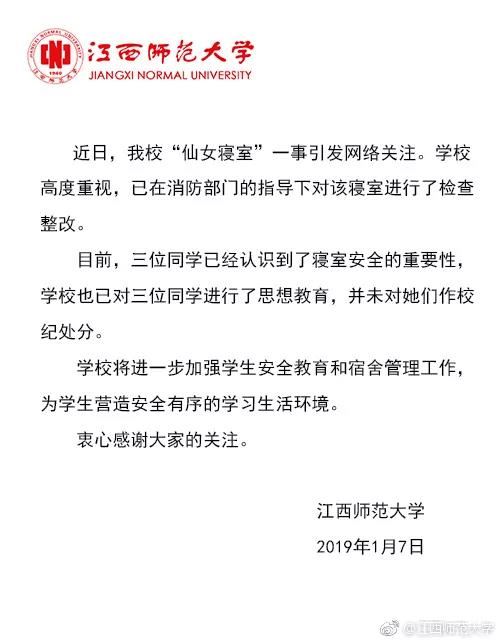 7日,江西师范大学回应,学校高度重视,已在消防部门的指导下对该寝室检查整改。学校已对三位同学进行了思想教育,并未对她们作校纪处分。↓↓↓