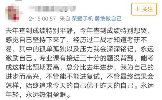 还有“二战”的考生深知考研的不易,去年查成绩很平静,今年却特别想哭,为自己进步而高兴,无论结果如何,始终追求今天的自己优于昨天的自己↓↓↓