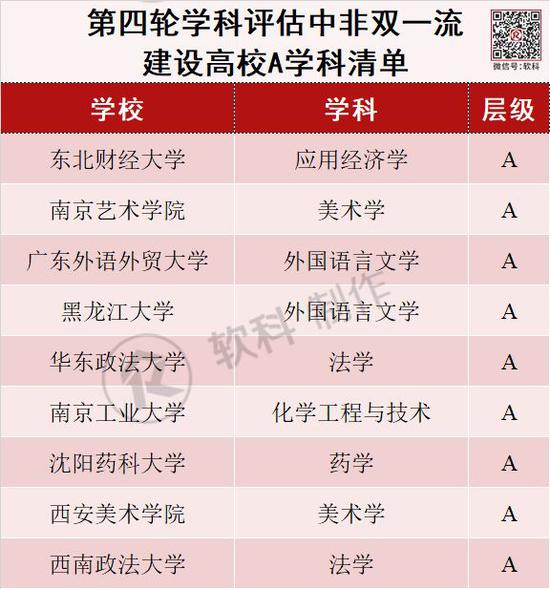 东北财经大学、南京艺术学院、广东外语外贸大学、黑龙江大学、华东政法大学、南京工业大学、沈阳药科大学、西安美术学院、西南政法大学9所高校在学科评估中拥有A学科,均为这些院校的特色学科。