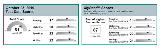 考生过去两年的有效托福成绩中,听说读写每项的最高分组合在一起,拼成该考生的最优成绩,和当次考试成绩一起出现在成绩报告中,也被称为 MyBest score。