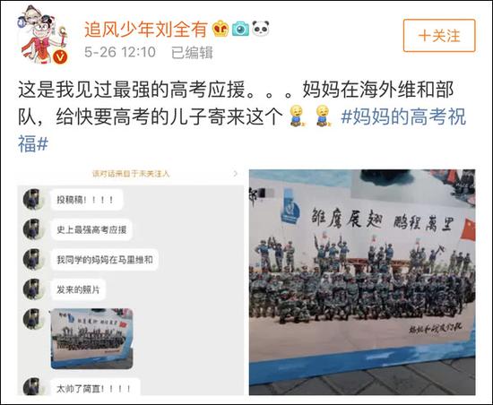 合影中的中国维和战士们摆出各种帅气姿势为郑同学加油打气,“史上最强高考应援团”获得网友们阵阵惊呼赞叹,还有网友调侃:“这真不是在暗示儿子‘考砸了突突了你’?”