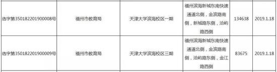 其中,天津大学滨海校区一期,位于福州滨海新城东南快速通道北侧、金滨路南侧、新城路东侧、洽屿路西侧,用地面积134638平;天津大学滨海校区三期,位于福州滨海新城东南快速通道北侧、金滨路南侧、洽屿路东侧、金江路西侧,用地面积83675平。