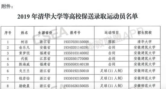 在这份通知所附的《2019年清华大学等高校保送录取运动员名单》中,身为浙江生源的柯洁被列在了第一个的位置,运动项目为围棋,而后面写着的招生单位则是清华大学。