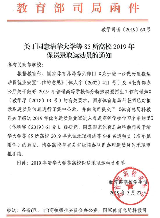 经研究,同意国家体育总局科教司关于清华大学等85所高校2019年免试录取柯洁等948名运动员(名单见附件)的意见。请各高校与有关省级招办联系办理运动员的录取审批手续。