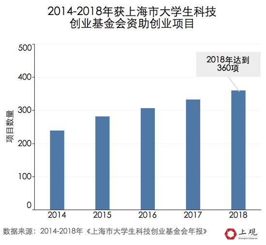 另一个增长较快的数据是自主创业的毕业生五年间增长了53%。创业领域主要集中在信息技术、资讯服务等行业。2018年,获上海市大学生科技创业基金会资助创业项目共计360项,总计资助金额8008万元。较2017年的332 项, 7428 万元有明显增加。复旦大学和华东师范大学均以31名自主创业的毕业生领先。