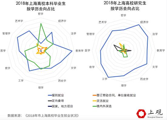 从学科来看,基础学科读研的比例要明显高于应用型的学科,比如哲学、文学、历史学、理学,另一种是就业相对狭窄的学科,比如农学和医学。研究生毕业后,攻读博士、博士后的比例也不低。