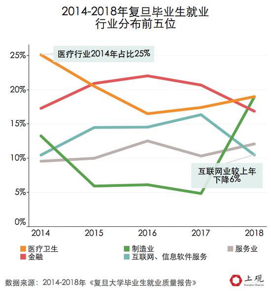 但相比前几年,金融业的热度在下降,这是因为需求在下滑。上海交通大学2018年就业质量报告里提到,“与往年相比,信息传输、软件和信息技术服务业单位数量仍在逐年增加,但受到市场行情的影响,金融业对毕业生需求量相比往年略有下滑。”