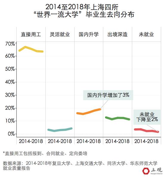 毕业后深造比例在最近五年的上升十分明显。以4所一流大学(复旦、上交、同济、华师)为例,2014年至2018年选择境内外升学的人数占比由28.86%升至30.42%,其中选择国内升学的人数上升了3个百分点至19%。签约、合同就业的人数则维持在六成左右,未就业人数占比持续下降。