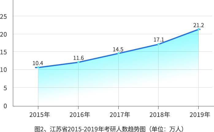 江苏省一直是考研大省,从2015年的10.4万人到2019年的21.2万人,5年间,考研人数翻了一番还多。