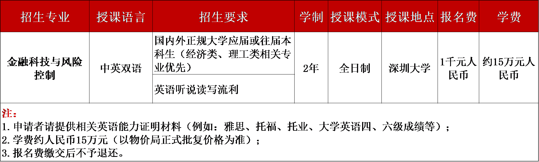 金融科技与风险控制专业是中国教育部批准的由深圳大学与法国南特高等商学院共同推出的中外合作办学项目。课程采用中英双语授课形式,全日制教学,全部课程学习在深圳大学完成。中法双方组建实力雄厚的教学团队,旨在发挥两校优势,合作培养具有国际竞争力的复合型金融科技人才。支撑我国在金融科技领域保持国际领先地位,弥补金融科技人才短缺,服务粤港澳大湾区和深圳先行示范区金融科技产业的未来发展。