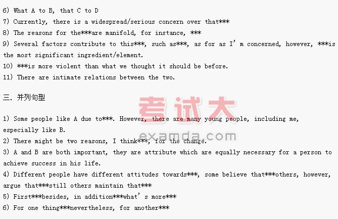 这里列其中一些较简单实用的,希望能对大家有所帮助(不过,建议同学们最好自己写,自己收集,印象会深很多,每天花10分钟过过,绝对值得。另外,我列的句子很有限,多半是骨架,大家要学会扩展,并且在记忆的时候多联想一下。举例来说,一篇你的文章,用心改一下,好好套用几个句式,改些档次较高的词和词组,可以提高不少哦):