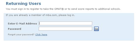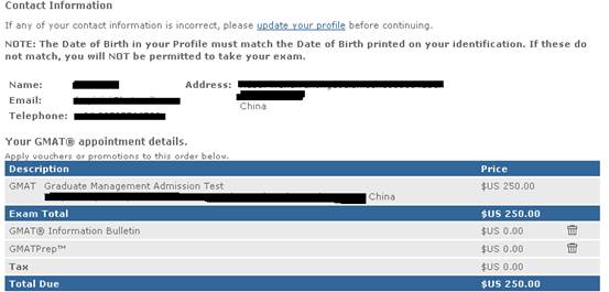 如考生已经是 mba.com/china 网站的注册用户,但没有 GMAT ID ,进入mba.com/china后,请以用户名(邮件地址)Log in ,根据指导创建考生个人信息文档(profile),并保存profile。考生需要提供基本的个人资料如:姓名、邮寄地址、电话号码和电子信箱地址等。完成这一步后,网站会显示提示信息,请考生等待审核,在此期间无法预定考试或选择其他服务。两个工作日以后,请重新登录etest 网站,以用户名(邮件地址)再次登录mba.com/china网站,点击view appointment activity链接,可以看到本人的GMAT ID 。至此,即可进入到支付考费的步骤了。