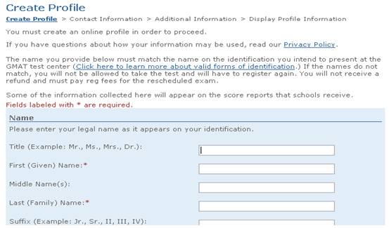 如果考生还不是mba.com/china网站注册用户,进入mba.com/china网站后,在log in information下,按照要求填写姓名、地址、电话、出生日期、性别等信息进行注册。完成后,即可重复上述步骤,创建并保存profile ,获得 GMAT ID ,转到支付费用的步骤。