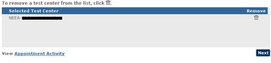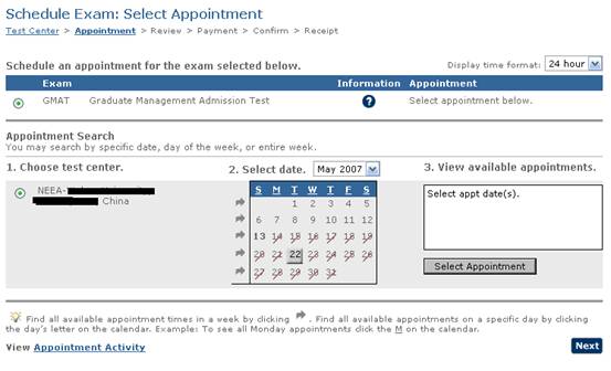 选好日期,空白方框若显示"No appts available",则表示那天没有考位 选好日期后,方框显示"Appointment is scheduled. Click Next.",然后点击next,出现界面如下: