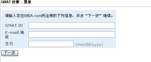 当考生成功注册为 mba.com/china 的网站用户,并获得 GMAT ID 后,即可登录 etest 网站,点击付费链接,使用 GMAT ID , mba.com/china 注册用户名( email 地址)和生日三项联合信息进行登录,开始进入付费程序。 在中国(不含港、澳、台地区)报名参加 GMAT 考试的考生,付费可采用人民币网上支付方式: