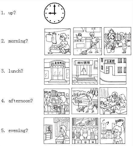 口试教师跟考生A 说:(把卡递给考生A) A, here is a card for you. Now, ask him/her five questions with the help of the card. Find out what he/she does on Sundays.口试教师跟考生B 说:(把卡递给考生B) Here is a card for you, B. Now, answer his/her questions according to what you do on Sundays. Or you can use what is there on your card to help you.