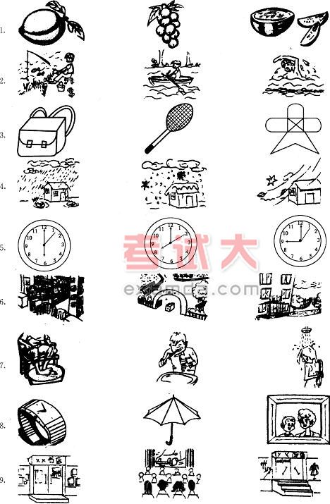 在本节中,你将听到10个句子,每句话配有A、B、C三幅图片,请选择与句子内容相符合的一幅图片,并标在试卷的相应位置。每句话后有15秒钟的停顿,以便选择图片并看下一组图片。每句话读两遍。