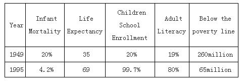 According to this table, we can see that in 1949, when the new nation was founded for the first year, Chinese had by far the lowest quality of life in all the five indicators. When it came to the year 1995, the situation changed a lot. China is eliminating its poverty year by year.