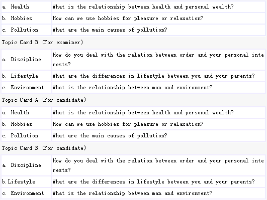 Interlocutor:Now, in this part of the test I'm going to give each of you a list of three different topics. I'd like you to select one of the topics and give a short presentation of about 2 minutes.