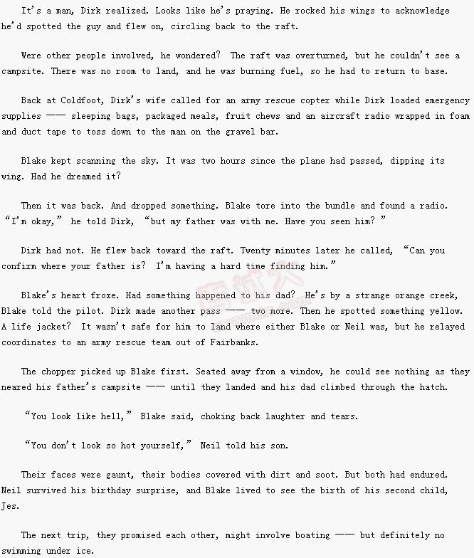 By Monday, the third day without food, both men were growing weaker. Blake was right about the planes —— he'd seen several flying at 10,000 feet, but they couldn't see him. He decided to build a signal fire. The river had washed 30-foot spruce trees into a logjam nearby. Even small ones weighed 100 pounds. Blake struggled to carry them to his fire and quickly became exhausted.