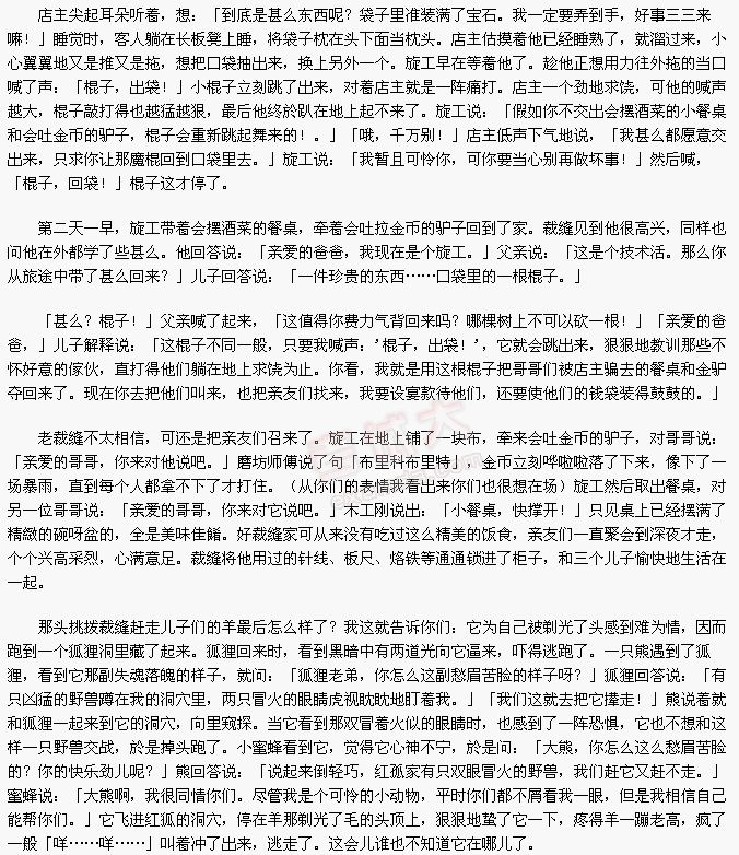 ¡¡¡¡ÀÏÈËÎÊ£º¡¸º¢×Ó£¬ÄãÏÖÔÚ×öÄÄÒ»ÐУ¿¡¹¶ù×ӻشð˵£º¡¸Ç×°®µÄ°Ö°Ö£¬ÎÒÊÇÄ¥·»Ê¦¸µÁË¡£¡¹¡¸ÄãÂÃÐлØÀ´´øÁËÉõô»Ø¼Ò£¿¡¹¡¸´øÁËһͷ¿×Ó¡£¡¹¸¸Ç×˵£º¡¸ÕâÀï¶àµÄÊÇë¿£¬ÎÒÇéԸҪͷÎÂѱµÄÑò¡£¡¹¶ù×Ó˵£º¡¸¿ÉÎÒ´ø»ØÀ´µÄ²»ÊÇÆÕͨ¿×Ó£¬¶øÊÇһͷ½ð¿¡£Ö»ÒªÎÒ¶ÔËü˵£º'²¼Àï¿Æ²¼ÀïÌØ'£¬ÕâÍ·Ìý»°µÄÉü¿Ú¾Í»áͳöÂúÂúÒ»°ü½ð×Ó¡£Äã°ÑÇׯÝÃǶ¼ÕÒÀ´£¬ÎÒÈÃËûÃǶ¼³ÉΪ¸»ÎÌ¡£¡¹²Ã·ì˵£º¡¸ÎÒºÜÀÖÒâ¡£ÕâÑùÎҾͲ»ÓÃÔÙ²ÙÕëÏßÀͶÙÁË¡£¡¹Ëû×Ô¼ºÅÜÈ¥½«Ç×ÆÝ¶¼ÕÒÁËÀ´£¬µÈ´ó¼Òµ½Æëºó£¬Ä¥·»Ê¦¸µÈÃËûÃÇ×øÏ£¬ÔÚµØÉÏÆÌÁËÒ»¿é²¼£¬°Ñ¿×ÓÇ£Á˽øÀ´¡£¡¸ÏÖÔÚÇë×¢Ò⣡¡¹Ëµ×ÅËû¶Ô¿×Óº°ÁËÉù¡¸²¼Àï¿Æ²¼ÀïÌØ¡¹¡£È»¶øÂ¿×ÓûÍÂҲûÀ³öÈκνð±Ò£¬ËµÃ÷ÕâÉü¿Ú¶Ô´ËÒ»Çϲ»Í¨£¬ÒòΪ²¢·ÇËùÓп×Ó¶¼ÄÜͳö½ð±ÒµÄ¡£Õâλ¿ÉÁ¯µÄÄ¥·»Ê¦¸µÀ³¤ÁËÁ³£¬ÖªµÀ±»ÆÁË£¬ì¶ÊÇÇëÇóÇ×ÓÑÃÇÔÁ¡£ËûÃÇɢȥʱºÍÀ´µÄʱºòÒ»ÑùÇî¡£