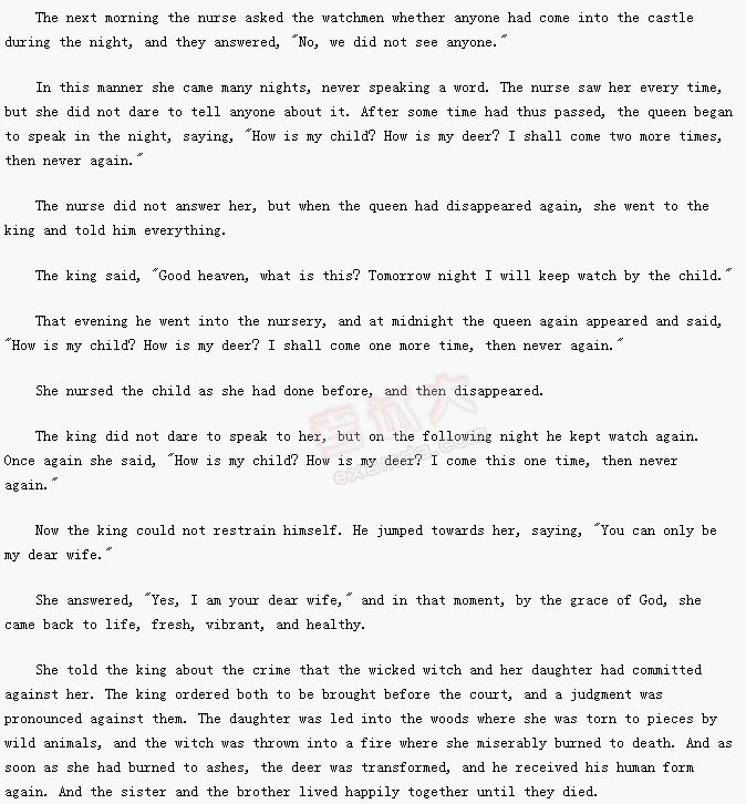 The king went away, not knowing that a false queen was lying there in her bed. At midnight when everyone was asleep, the nurse who was sitting in the nursery by the cradle, and who was the only one still awake, saw the door open and the true queen walk in. She took the child from the cradle, laid him on her arm, and nursed him. Then she fluffed up his pillow, laid him back down, and covered him with his little quilt. And she did not forget the deer, but went to the corner where he was lying and stroked his back. Then she went back out through the door without saying a word.