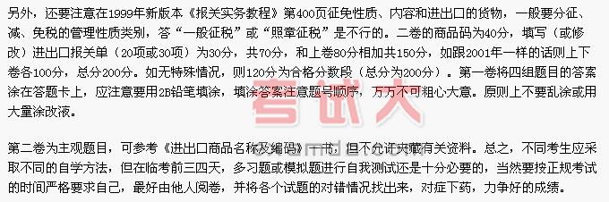 总之,教材的第二、第四章贸易术语和合同的主要内容为重点。已考过的四次试卷中的海关英语(占10分),以《海关法》、《关税条例》、《稽查条例》为主,现新版本《报关实务》没有了这些内容,以报关常用词组、单词、语句、介词、缩写语及港口名称中英文对照为主要内容。二卷商品编码试题,第一次试卷出了20个(20分);第二次试卷出了30个(30分);第三、四次也各出了30个,但L一20个为20分。2L一30个为20分,所以为40分。第三、四、五次试卷均出了<HS>的26个章的商品及编码,以农副产品和纺织品为最多,又以4—8个为宜。第六次改为选择题。其次,以28章无机化学品、29章有机化学品、30章化肥、32章染料、39章塑料、40章橡胶、47章纸浆、68章沙石科石棉、84章机械、85章电器、87章汽车及零部件、90章光学及仪表为主要内容。关于报关单试题,在第一、二次试卷中为改错和填写报关单,第三、四次试卷中则改为填写,第六、七次改为选择题。