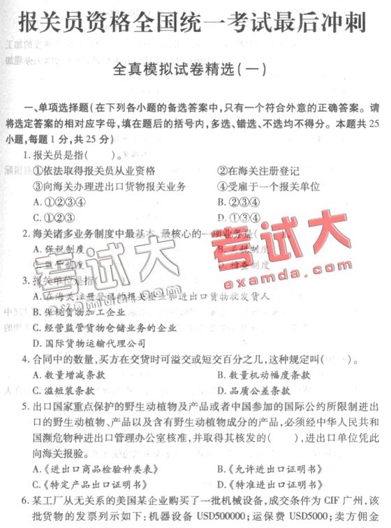 2006年报关员考试最后冲刺全真模拟试题精选(1)