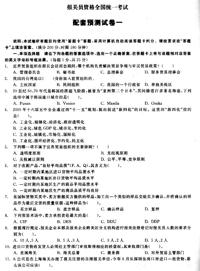2006年报关员资格考试统一考试配套冲刺(1)试卷