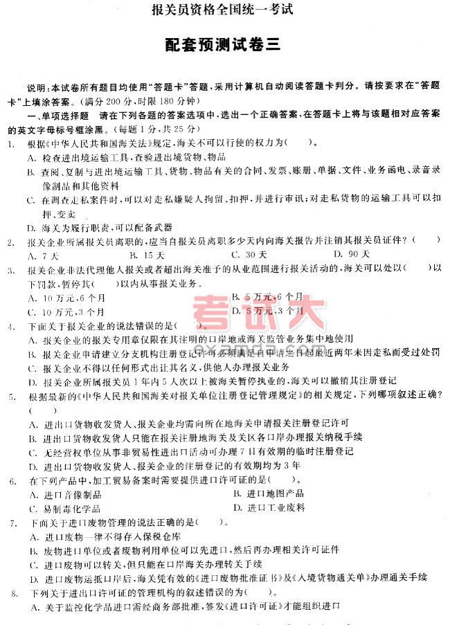 2006年报关员资格考试统一考试配套冲刺(3)试卷
