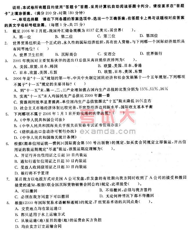 2006年报关员资格考试统一考试配套冲刺(7)试卷