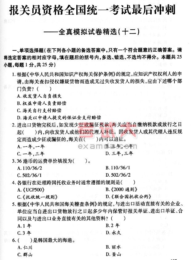 2006年报关员资格考试全国统一考试最后冲刺全真模拟试卷精选(十二)
