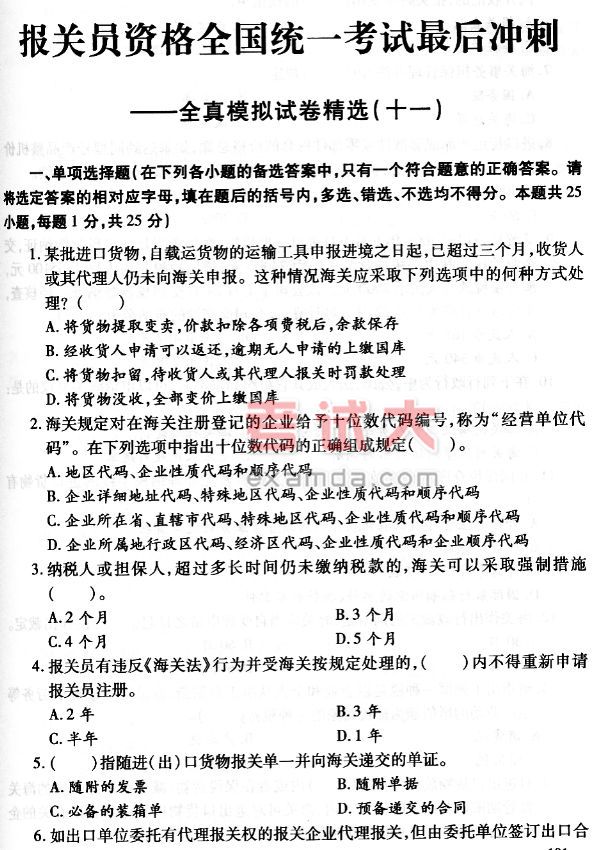 2006年报关员资格考试全国统一考试最后冲刺全真模拟试卷精选(十一)
