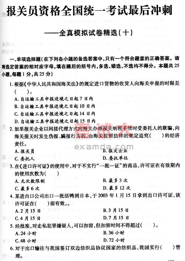 2006年报关员资格考试全国统一考试最后冲刺全真模拟试卷精选(十)