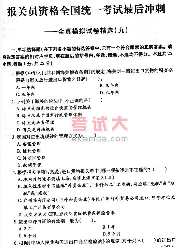 2006年报关员资格考试全国统一考试最后冲刺全真模拟试卷精选(九)