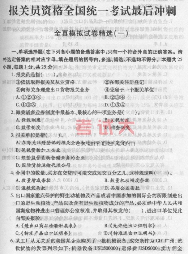 2006年报关员资格考试全国统一考试最后冲刺全真模拟试卷精选(一)