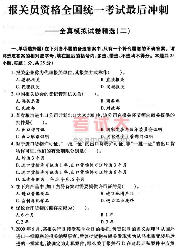 2006年报关员资格考试全国统一考试最后冲刺全真模拟试卷精选(二)