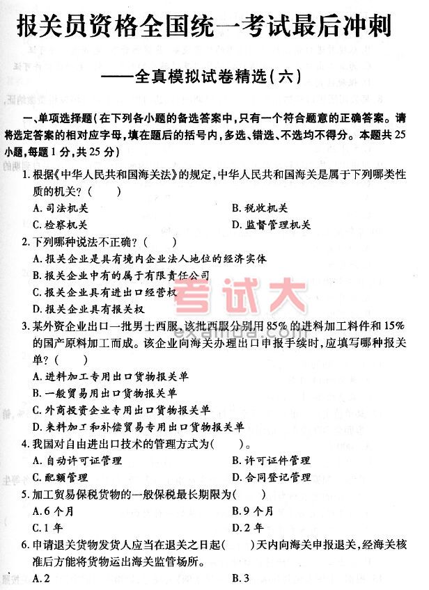 2006年报关员资格考试全国统一考试最后冲刺全真模拟试卷精选(六)