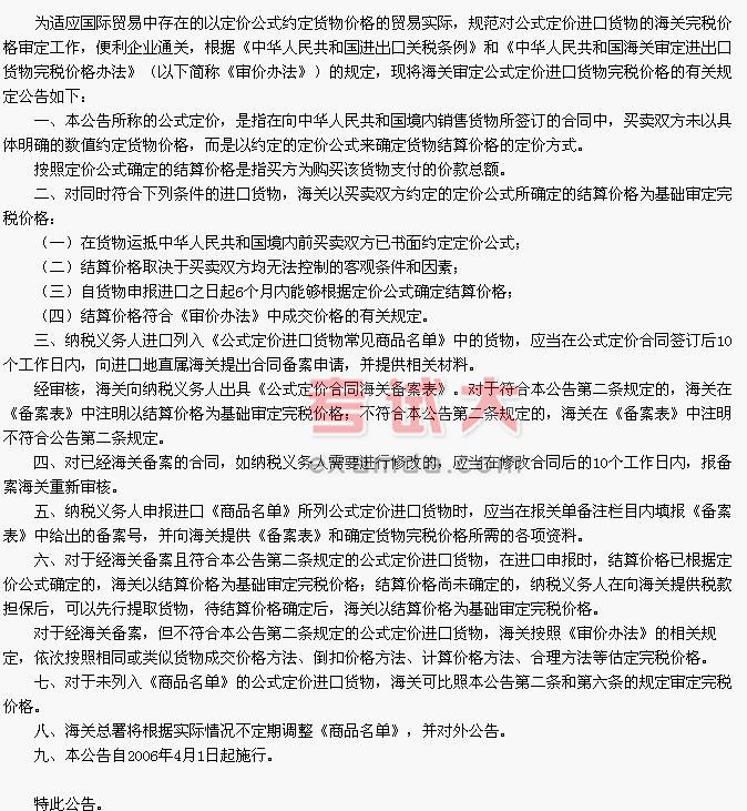 海关总署公告06年第11号(关于公布海关审定公式定价进口货物完税价格的有关规定)
