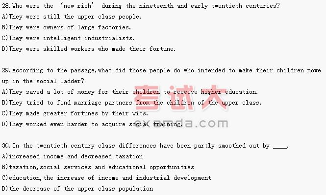 During the nineteenth and early twentieth centuries the possession of wealth inevitably affected a person’s social position.Intelligent industrialists with initiative made fortunes by their wits which lifted them into an economic group far higher than that of their working—class parents.But they lacked social training of the upper class,who despised them as the “new rich.”