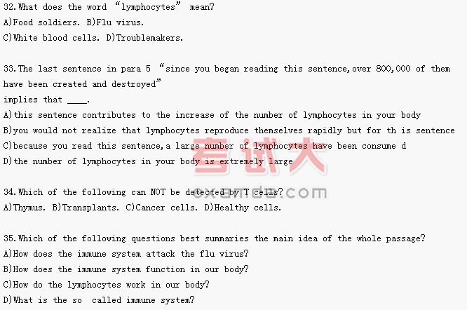 neck.Here,special hormones(荷尔蒙)turn lymphocytes into fighting cells,called T cells.