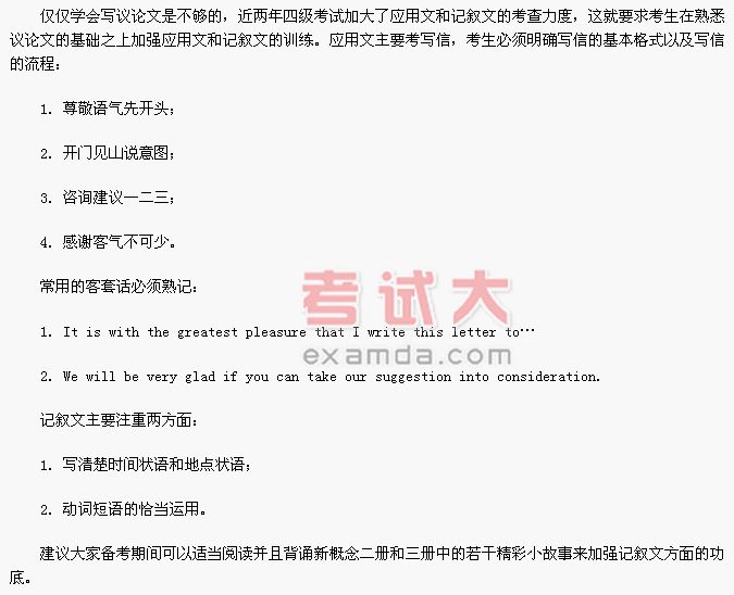 纵观历年来的考题,我们不难发现议论文占据着七成以上的比例,因此首先我们要掌握议论文的写作要领。按照提纲进行构思,务必做到写好每段的主题句和扩展句。主题句是表达段落主题的句子,它阐明一个段落的中心思想,是段落的核心,段落中的其他各句都与它紧密相连并围绕它展开。扩展句就是解释或者说明段落中心思想的句子。写扩展句时要注意条理性,比如引出三条不同的理由可以分别用:First of all, furthermore, the last but not the least。