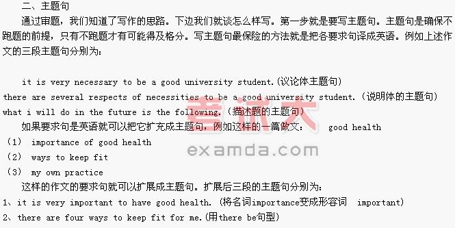 我们审题的目的就在于根据不同的体裁来确定不同的写作方法。通过审题,我们可以看出四、 六级作文大都是三段式。如上例第一段为议论体、第二段为说明体、第三段为描述体。议论体有议论体的写作方式、说明体有说明体的写作方式、描述体也有它自身的写作特点。第一段为议论文: 它的写作特点是要有论点和论据,而且往往从正反两面来论述。例如上面题目的第一段的写作思路是:做合格大学生,会怎么样(这是从正面论述);不能做倒合格大学生,会怎么样(从反面论述);所以我们要做合格的大学生(结论)。第二段为说明文:它的写作特点是从几方面或几条来说明一个问题,就跟某一机器的说明书一样通过1、2、3说明它的用途。就以上面的作文而言,我们从三个方面(德智体)来说明做合格大学生的必要性。第三段为描述文:以“人”为中心描述一个“做”的过程。跟上两段相比,本段的主语多为人称代词。它要与第二段相呼应进行描述。