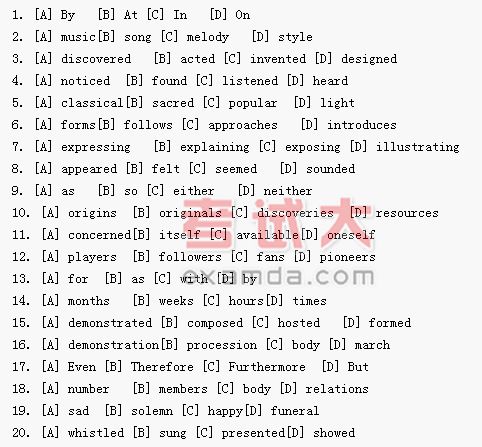 Music comes in many forms; most countries have a style of their own. --1-- the turn of the century when jazz was born, America had no prominent --2-- ofits own. No one knows exactly when jazz was --3--, or by whom. But it began to be --4-- in the early 1900s. Jazz is Americas contribution to --5-- music. In contrast to classical music, which --6-- formal European traditions, jazz is spontaneous and free form. It bubbles with energy, --7-- the moods, interests, and emotions of the people. In the 1920s jazz --8-- like America, and --9-- it does today. The --10-- of this music are as interesting as the music --11-- . American Negroes, or blacks, as they are called today, were the jazz --12--. They were brought to Southern States --13-- slaves. They were sold to plantation owners and forced to work long --14--. When a Negro died his friend and relatives --15-- a procession to carry the body to the cemetery. In New Orleans, a band often accompanied the --16--. On the way to the cemetery the band played slow, solemn music suited to the occasion. --17-- on the way home the mood changed. Spirits lifted. Death had removed one of their --18--, but the living were glad to bealive.The band played --19-- music, improvising(即兴表演) on both the harmony andthe melody of the tunes --20-- at the funeral. This music made everyone want to dance. It was an early form of jazz.