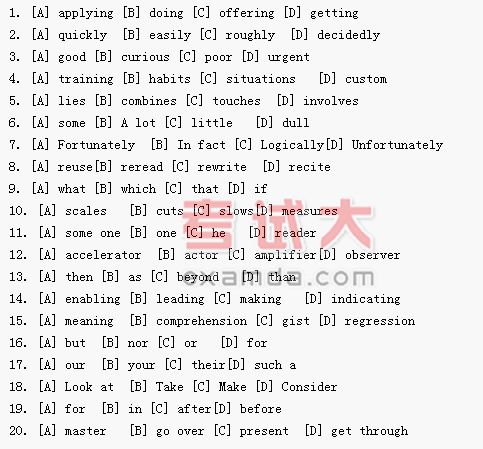 To overcome these bad habits, some reading clinics use a device called an --12--, which moves a bar (or curtain) down the page at a predetermined speed. The bar is set at a slightly faster rate --13-- the reader finds comfortable, in order to "stretch" him. The accelerator forces the reader to read fast, --14-- word--by--word reading, regression and subvocalization, practically impossible. At first --15-- is sacrificed for speed. But when you learn to read ideas and concepts, you will not only read faster, --16-- your comprehension will improve. Many people have found --17-- reading skill drastically improved after some training. --18-- Charlce Au, a business manager, for instance, his reading rate was a reasonably good 172 words a minute --19-- the training, now it is an excellent 1,378 words a minute. He is delighted that how he can --20-- a lot more reading material in a short period of time.