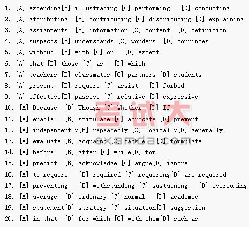 Many students find the experience of attending university lectures to be a confusing and frustrating experience. The lecturer speaks for one or two hours, perhaps --1-- the talk with slides, writing up important information on the blackboard, --2-- reading material and giving out --3--.The new student sees the other students continuously writing on notebooks and --4-- what to write. Very often the student leaves the lecture --5-- notes which do not catch the main points and --6-- become hard even for the --7-- to understand.