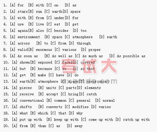 Space is a dangerous place, not only because of meteors(流星) but also because of rays from the sun and other stars. The atmosphere again acts --1-- our protective blanket on --2--. Light gets through, and this is essential --3-- plants to make the food which we --4--. Heat, --5--, makes our environments tolerable and some ultraviolet rays(紫外线的) penetrate the --6--. Cosmic(宇宙的) rays of various kinds come --7-- the air from outer space, but --8-- quantities of radiation from the sun are screened off. --9-- men leave the atmosphere they are --10-- to this radiation; --11-- their spacesuits or the walls of their spacecraft, if they are inside, --12-- prevent a lot of radiation damage. Radiation is the greatest known danger to explorers in --13--. Doses of radiation are measured in --14-- called "rems(雷目)". We all --15-- radiation here on earth from the sun, from cosmic rays and from radioactive minerals. The "--16--" dose of radiation that we receive each year is about two millirems; it --17-- according toswheresyou live, and this is a very rough estimate. Scientists have reason to think --18-- a man can --19-- far more radiation --20-- without being damaged; the figure of 60 rems has been agreed.