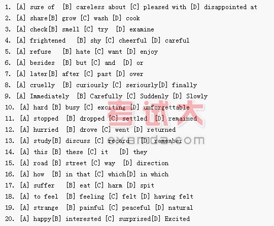 An hour --7--, however, they were all astonished when the gardener rushed on and said --8-- the dog was dead. --9--, the officers jumpedsintostheir cars and rushedsintosthe nearest hospital. Pumps (泵) were used and the officers had a very --10-- time getting rid of the mushrooms that --11-- in their stomachs.When they --12-- to the police station, they sat down and started to --13-- the mushroom poisoning. Each man explained the pains that he had felt and they agreed that --14-- had grown worse on their --15-- to the hospital. The gardener was called to tell the way --16-- the poor dog had died. "Did it --17-- much before death?" asked one of the officers, --18-- very pleased that he had escaped a --19-- death himself. "No," answered the gardener looker rather --20--. "It was killed the moment a car hit it."