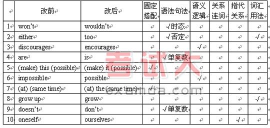 改错也是一项综合测试题型。虽然形式不同,但其测试重点与完形填空所覆盖的测试内容大致相同。在解答改错题时,应主要从以下几个方面进行观察和判断: